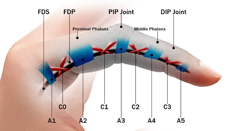 Según los estudios, las poleas A2 y A4 son las más grandes e importantes en la flexión de los dedos cuando escalamos y, por tanto, las que más se lesionan.